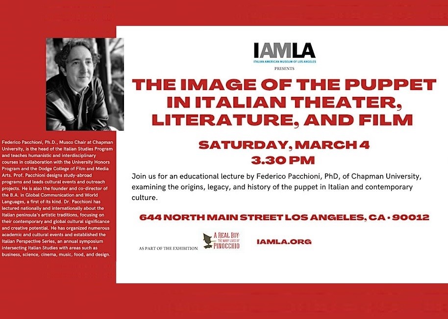 The IAMLA presents The Image of the Puppet in Italian Theater, Literature, and Film a lecture by Federico Pacchioni, Ph.D. examining the origins, legacy, and history of the puppet in culture. The event is part of the exhibition A Real Boy: The many Lives of Pinocchio.