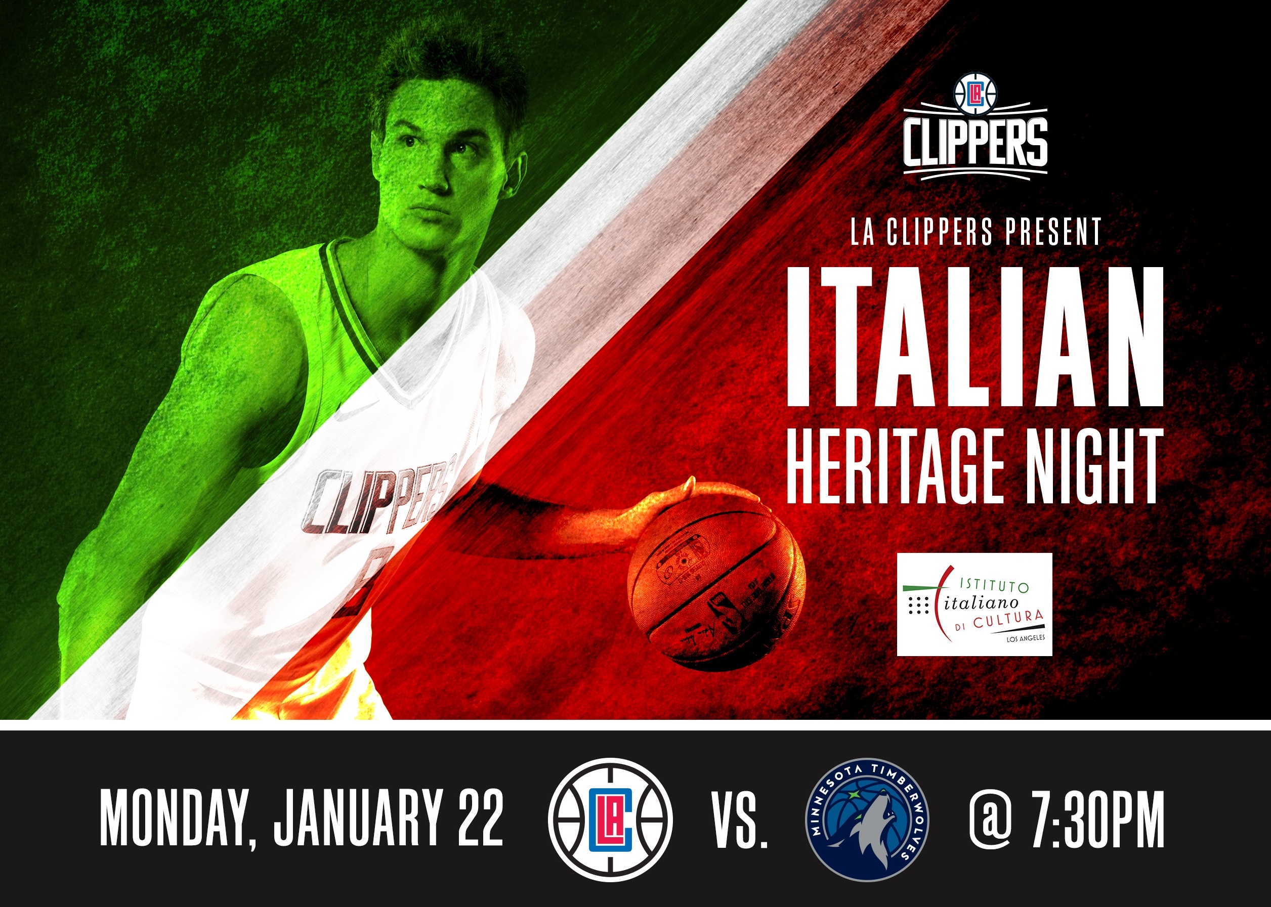 LA Clippers present Italian Heritage Night: Monday, January 22, 2018 vs Minnesota Timberwolves at 7:30PM. Order your tickets online, use promo code “ITALIAN”, and receive a commemorative T-shirt. We look forward to seeing you at the game!