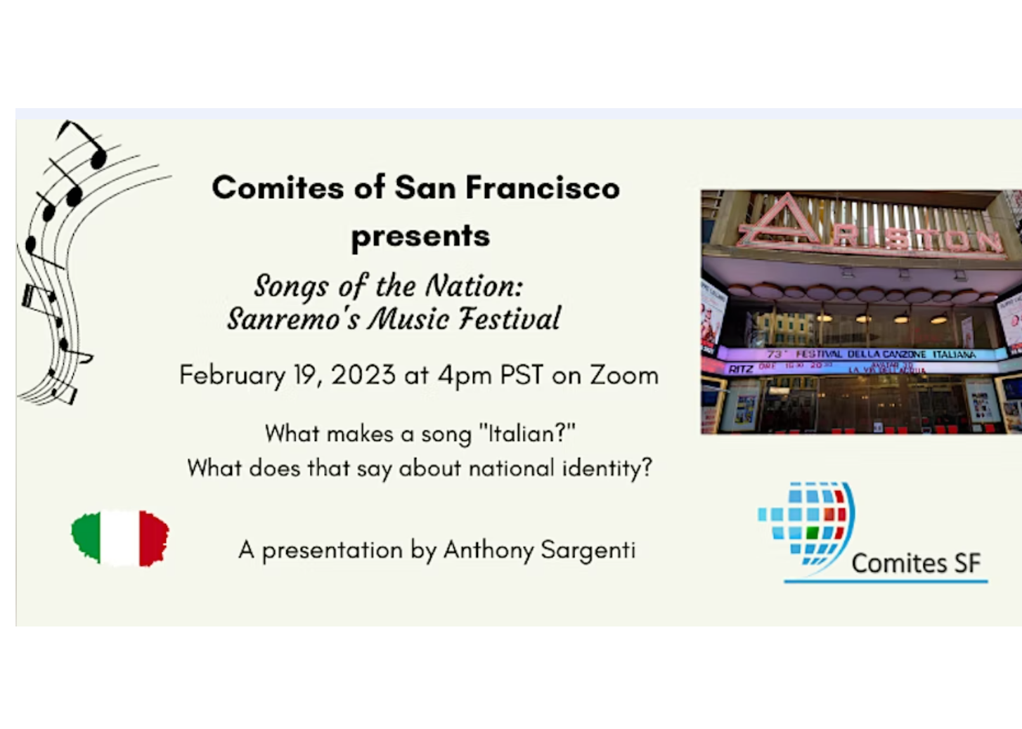 Sunday, 19 February 2023, 16:00 – 17:15 PST. Online zoom. Il Festival della canzone italiana di Sanremo annually highlights the best of Italian singers, songwriters, and songs. The winner receives national and international recognition, going on to represent Italy at the Eurovision Song Contest. Sanremo has become a cultural institution that shines the spotlight not only on musical productions, but an Italian identity.