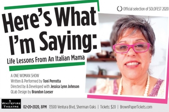 Thursday, February 20 at 8PM. Whitefire Theatre. 13500 Ventura Blvd., Sherman Oaks, CA, 91423. Ticket: $20.00. Click here for tickets. Written and performed by Toni Perrotta. Artfully directed by and developed with Jessica Lynn Johnson. Premiering in Solofest at the Whitefire Theatre in Sherman Oaks. THE LARGEST SOLO FESTIVAL ON THE WEST COAST !!!!!...