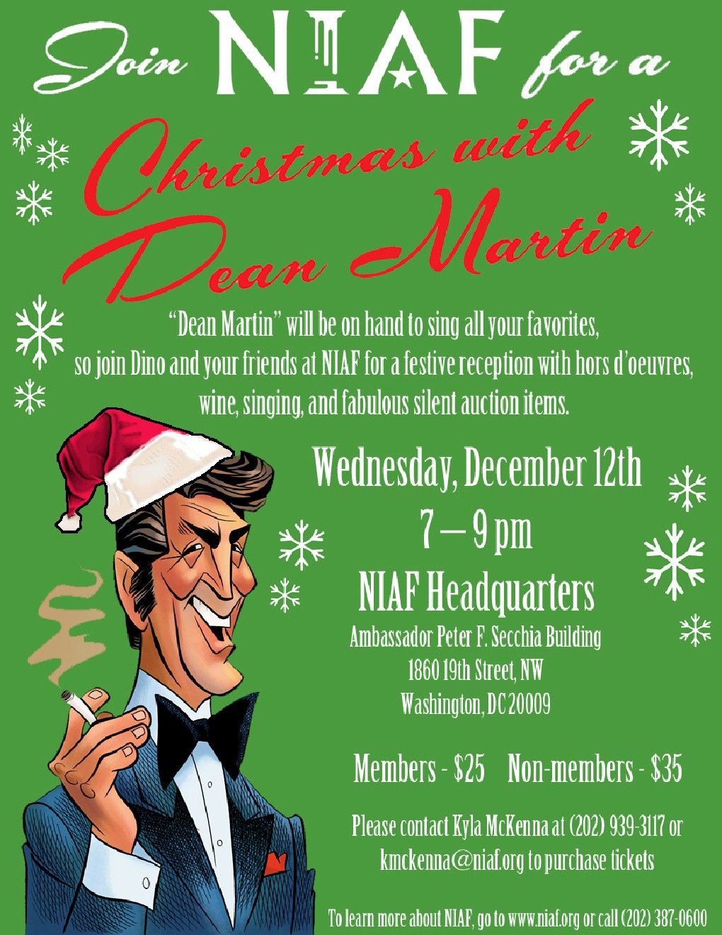 Join NIAF and their friends for a spirited holiday reception on Wednesday, Dec. 12, at NIAF headquarters! "Dean Martin" (actor, vocalist and master Dino tribute performer Eric Richardson) will be on hand to bring back memories of the humor and songs that made the Rat Pack's "King of Cool" so cool. This fun and festive reception includes hors d'oeuvres, wine, singing, a silent auction and a drawing! Everyone's welcome! Dec. 12, 7-9 p.m., at NIAF Headquarters, The Ambassador Peter F. Secchia Building, 1860 19th St. NW, Washington, D.C. NIAF members: $25; non-members: $35. For more information and tickets, contact Kyla McKenna at 202-939-3117 or kmckenna@niaf.org.