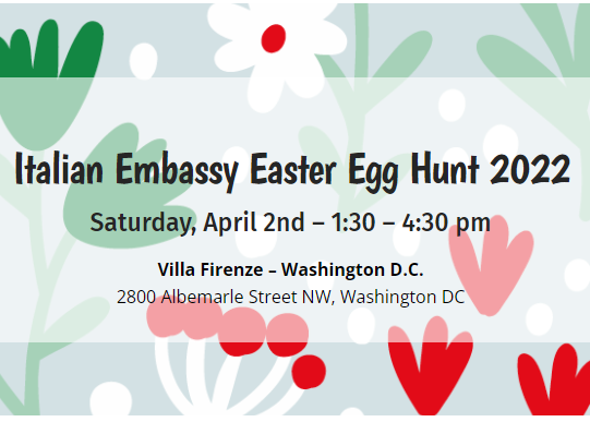 The Embassy of Italy, in collaboration with American Italian Food Coalition & The Italian Cultural Society of Washington DC cordially invites you to: Italian Embassy Easter Egg Hunt 2022, a fundraising event to benefit a local children’s charity: Center for the Advancement of Innovative Health Practices.