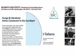 December 6, 2015 - Sunday 7:00 PM - Busboys and Poets, Brookland - 625 Monroe Street Northeast - Washington, District of Columbia 20017. Come enjoy Italy's rock, pop and folk music from the 1960s to this day! The i-Talians will perform songs by singers-songwriters (cantautori) including Vecchioni, Guccini, De Gregori, De André, Baglioni, Branduardi and Battisti. Every song will be provided with an English translation and commentary by Prof. Francesco Ciabattoni (Georgetown University), whose forthcoming book La citazione è sintomo d'amore (Rome: Carocci, 2015) reveals the literary references in the songs.