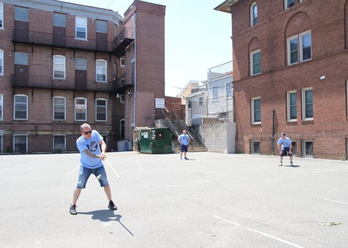 Split into teams of five people, these men comprised the 10th annual John Marzano Half-Ball Tournament, hosted at the Christopher Columbus Charter School parking lot. Marzano was a major league catcher who died after a fall in 2008. Before he played for the Boston Red Sox, Texas Rangers, and Seattle Mariners, Marzano grew up in South Philly playing half-ball. Organizers said the tournament is part-fundraiser (to support youth baseball), part-awareness campaign for the old-school street game.