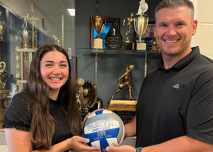 A recent addition was made to the trophy cases at Hammonton High School, as 2023 graduate Tiffany Paretti was recognized for her achievements on the volleyball court. Paretti was a four-year starter for the Blue Devils, setting a record with 206 career aces. A commemorative volleyball was placed in a trophy case near the gymnasium recently, honoring her accomplishment.