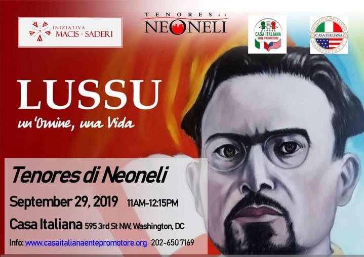 Sunday, September 29, 2019. 11:30 AM – 1:00 PM EDT. Casa Italiana, 595 3rd Street NW, Washington, 20001. The “Tenores di Neoneli” are a group of polyphonic singers from Sardinia (Italy). Founded in the little town of Neoneli in 1976, the group interprets the ancient Sardinian tradition of “a tenore” singing. A tenore singing is performed by groups of four male singers standing next to each other in a circle or semi-circle.