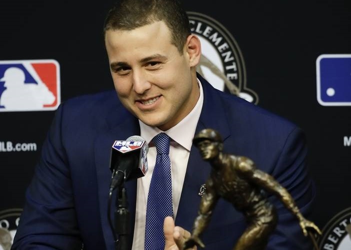 Chicago Cubs‘ All-Star Italian American first baseman Anthony Rizzo was presented the 2017 Roberto Clemente Award at Minute Maid Park prior to the start of game three of World Series between the Houston Astros and Los Angeles Dodgers on October 27, 2017. The Roberto Clemente Award, Major League Baseball’s prestigious award that recognizes sportsmanship, community involvement and positive contributions on and off the field, is given annually to a player who demonstrates the values Clemente displayed in his commitment to community and understanding the value of helping others. Each of the 30 MLB clubs nominate a player, and the winner is announced during the World Series.