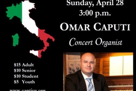 Sunday, April 28th at 3:00pm. St. John Cantius Church, 825 N. Carpenter St. Chicago, IL. This concert is sponsored by the Italian Cultural Institute of Chicago. Omar Caputi is the Titular Organist of the most prestigious organ in Italy, the four-keyboard mechanical organ made by the Zanin company and located in the St. Ritas Sanctuary in Turin, Art...