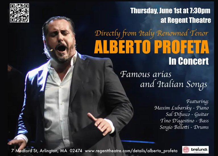 Don't miss the only concert in Boston by one of the most sought after voices - ALBERTO PROFETA at The Regent Theatre on June 1. Student of Luciano Pavarotti, Alberto is critically acclaimed tenor from Sicily, Italy. Alberto with perform some of the greatest Italian arias and popular songs such as Nessun Dorma, Parla Piu Piano, Granada, O Sole Mio and more.