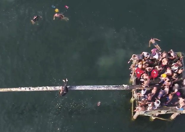 According to Atlas Obscura, the pole, 25 feet above the water line, is lubed with "everything slippery known to mankind, ranging from axle grease to tabasco sauce, banana peels to straight oil." The 2018 contest took place Friday, June 29 through Sunday, July 1, with winners crowned on each day. See the highlights below.