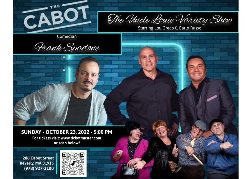 Sunday, October 23, 2022 at 5:00 PM. The Cabot, 286 Cabot St, Beverly, MA. Get your tickets now! "The Uncle Louie Variety Show" has been making audiences laugh for years with its hilarious and unique take on growing up as an Italian-American. The show is composed of two dynamic comedians, Lou Greco and Carlo Russo, who have gained international popularity with the comedic celebration of their Italian heritage.