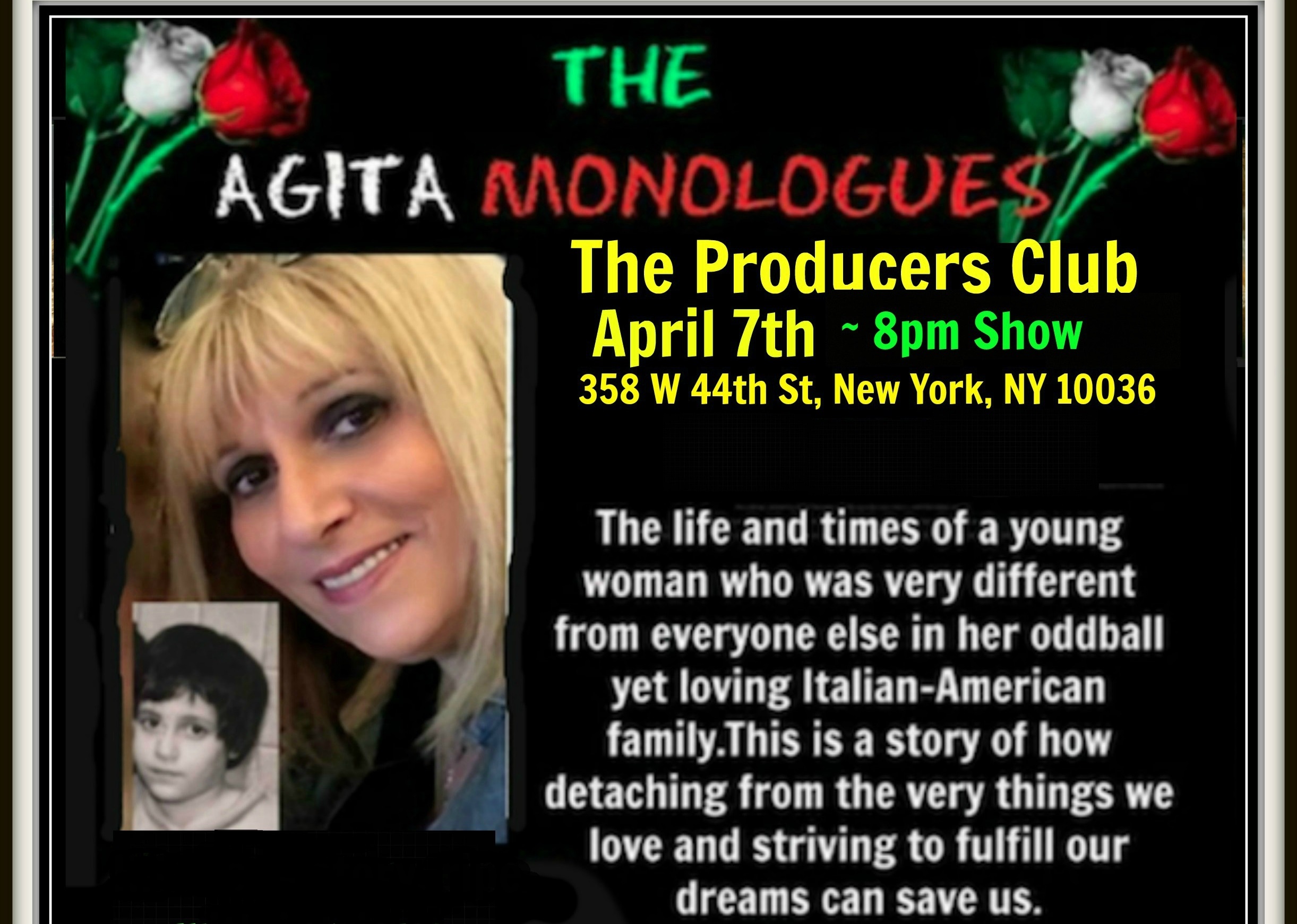 April 7 (Saturday) 8:00 pm. The Producers Club - 358 West 44th Street, Manhattan. The Agita Monologues. The life and times of a young woman who was very different from everyone else in her oddball yet loving Italian-American family. Being the youngest of four, comedienne/singer Maryann Maisano viewed the antics going on in her Italian-born parents home from a very different perspective than her siblings.