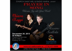 Cari amici, anche quest'anno siamo lieti di ospitare a New York la straordinaria cantante italiana CHIARA LUPPI e il suo ospite speciale MASSIMO SCATTOLIN per un Concerto di Natale intitolato "PRAYER IN SONG Welcome Joy into Your World". Chiara e Massimo presenteranno canzoni natalizie tradizionali, sia in italiano che in inglese, e arrangiamenti originali di preghiere. L'EVENTO E' GRATUITO. Donations welcomed