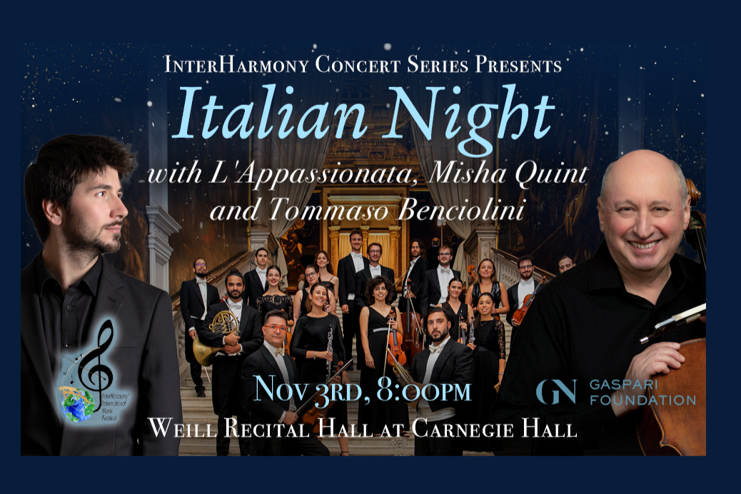 Italian Night promises an unforgettable journey through the enchanting melodies through the ages of Italian composers Boccherini, Respighi, Rota, and Sollima, and can be experienced by purchasing tickets online at www.carnegiehall.org, or by calling Carnegie Charge 212-247-7800. More information can be found at www.interharmony.com.
