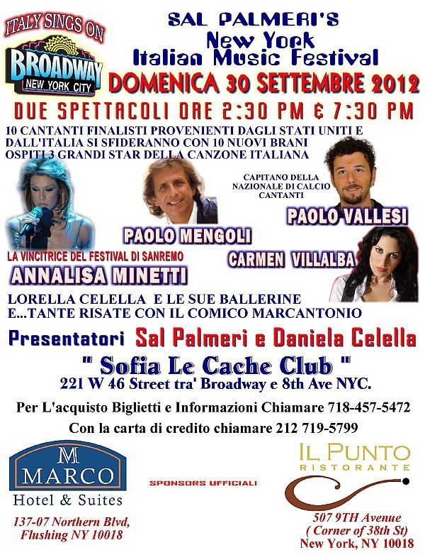 Tanti ospiti, dalla vincitrice del Festival di San Remo Annalisa Minetti (fresca campionessa con una medaglia alle paraolimpiadi), a Paolo Mengoli, passando per Paolo Vallesi e Carmen Villalba. Come presentatori ci saranno due voci molto note: Sal Palmeri e Daniela Celella. I due spettacoli, alle 14 e 30 e alle 19 e 30, si terranno presso "Sofia Le Cache Club" (221 w 46 Street tra Broadway e 8th Avenue).
