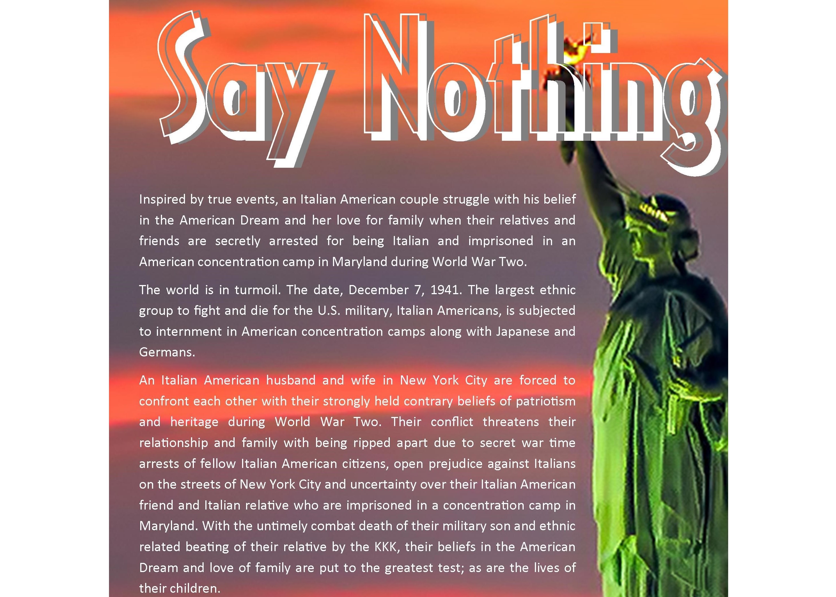 Inspired by true events, an Italian American couple in 1941 Little Italy, New York, struggle with his belief in the American Dream and her love for family when their loved ones are secretly arrested for being Italian and imprisoned in an American concentration camp in Maryland during World War Two. Based on the multi-award winning script (www.saynothingthefilm.com) by Letty Serra (www.imdb.com/name/nm1059418) and Jon Freda (www.imdb.com/name/nm0292719).