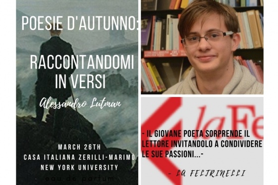 March 26, 6 PM. Casa Italiana Zerilli / Marimò - 24 W 12th St, New York, NY 10011. Writer and poet Alessandro Lutman reads from his collection of poems: Poesie d'autunno: Raccontandomi in versi (2015, Forum Editrice) With intermezzos performed by pianist Simona Premazzi. Introduced by: Luca Colussi, Associazione Filarmonica Udinese; Ellis Tommaseo,...