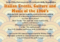 What events led to its economic woes of the '70s and beyond? Was it all simpler and better back in the fabulous '60s? Join us for this special lecture held by Walter Viali, that takes us back to a time when Italy was in a position of leadership on the global stage. November 18th, 7:00 pm, ICCC Houston, 1101 Milford St.. $10 ICCC Members, $15 Non-Members