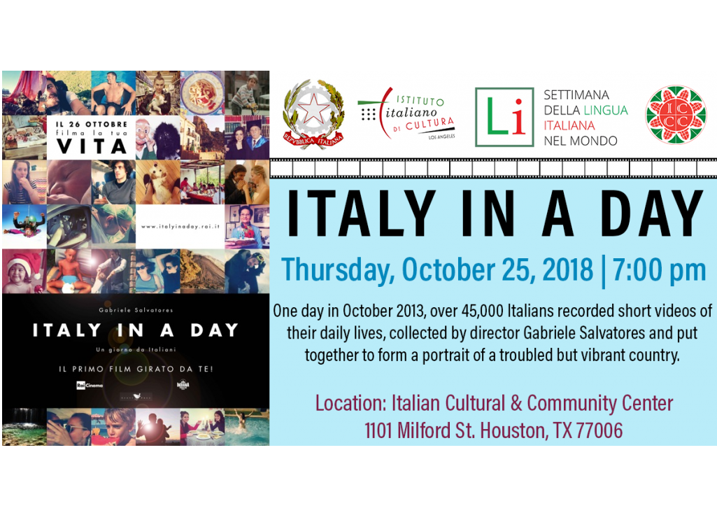 Thursday, October 25, 2018. Film starts at 7:00 pm Doors open at 6:45 pm and film begins at 7:00 pm. Italian Cultural & Community Center - 1101 Milford, Houston, Texas 77006
