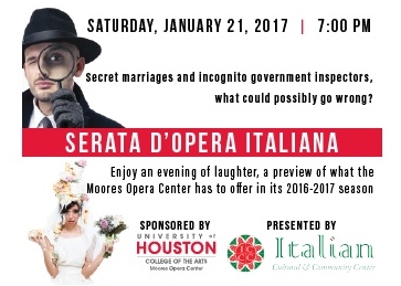 Join us at the ICCC for a wonderful evening of Italian Opera! Secret marriages and incognito government inspectors, what could possibly go wrong? Come enjoy an evening of laughter, a preview of what the Moores Opera Center has to offer in its 2016-2017 season. This event is sponsored by the University of Houston's College of the Arts - Moores Opera Center.