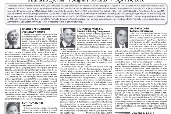 Pirandello Lyceum President, Dr. Dom Amara, has announced the 2018 recipients of the Pirandello Lyceum’s prestigious “I Migliori in Mens et Gesta” Award – the Best in Mind and Deeds. The Board of Governors has recognized a group of outstanding Americans of Italian descent who have made important contributions to their profession, to society, and to...