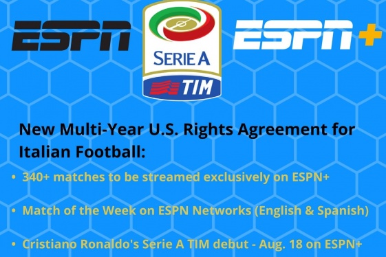 READ MOREESPN announced on Tuesday that it is entering an exclusive, multi-year deal with Serie A to broadcast matches in the United States. The deal will begin this month, and the first match will be on Saturday, Aug. 18 with Cristiano Ronaldo making his Serie A debut for Juventus against ChievoVerona on ESPN+. With the deal, ESPN will feature a Serie A Ma...