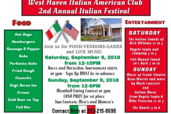 READ MOREFood, fun and music will take over the West Haven Italian American Club on Saturday, Sept. 8 and Sunday, Sept. 9, as the Italian Festival returns for it’s second year. A variety of food options will be available as well as a full bar and beer on tap. Saturday will feature a Bocce and Horseshoe tournament, starting at 3 p.m. Participants must sign u...