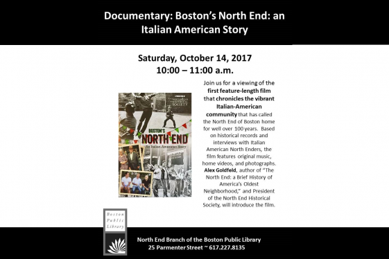 READ MOREWhen: Saturday, October 14, 2017 @ 10:00 – 11:00 a.m. -Where: North End Branch Library / 25 Parmenter Street Join us for a viewing of the first feature-length film that chronicles the vibrant Italian-American community that has called the North End of Boston home for well over 100 years. Based on historical records and interviews with Italian Amer...