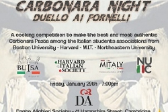 READ MOREFriday, January 29th - 7:00pm. Dante Alighieri Society - 41 Hampshire Street, CambridgeA cooking competition to make the best and most authentic Carbonara Pasta among the Italian students associations from Boston University - Harvard - M.I.T. - Northeastern University Live Music Entertainment by the Italian students association of B...