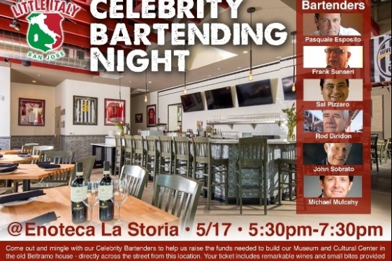 READ MOREThu, May 17, 2018. 5:30 PM – 7:30 PM PDT. Enoteca La Storia Downtown - 320 West Saint John Street - San Jose, CA 95110. Come and mingle with our celebrity bartenders and the rest of the community and you can help to raise the funds needed to build the Little Italy San Jose Museum and Cultural Center. Your ticket includes remarkable wines provided b...