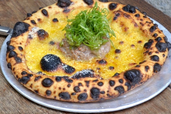 READ MOREA fire-pocked pizza hits a patio table at The Rose Venice, but tomato sauce and cheese are nowhere in sight. Instead, the base is bright yellow miso corn purée and a rosy seared bluefin tuna mountain rises up in the center, topped with towering shaved scallion wisps. Chef Jason Neroni takes a spoon and levels the savory mound, spreading what is bas...