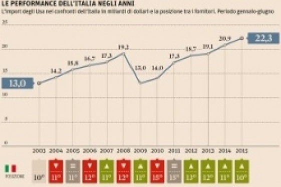READ MOREGrazie alla spinta dell'auto l'Italia torna nella top ten dei maggiori fornitori degli Stati Uniti. Un a decima piazza persa nel lontano 2003 e da allora mai più ritrovata , con un progressivo scivolamento del made in Italy che portava il nostro paese al 15esimo posto nel biennio 2010-2011. Da allora una lenta ma costante risalita, coronata nel pri...
