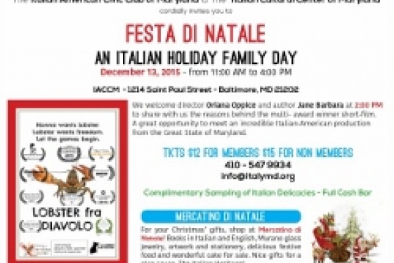 READ MOREThe Italian American Civic Club of Maryland & The Italian Cultural Center of Maryland cordially invites you to FESTA DI NATALE and ITALIAN HOLIDAY FAMILY DAY December 13, 2015 - from 11:00 AM to 4:00 PMIACCM - 1214 Saint Paul Street - Baltimore, MD 21202. We welcome director Oriana Oppice and author Jane Barbara at 2:00 PM to share with us...