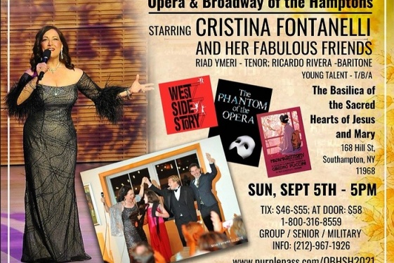 READ MORESeptember 5 (Sunday) 5:00pm. Basilica Parish of the Sacred Hearts of Jesus and Mary. 168 Hill Street, Southampton, NY. In the great tradition of the last 30 years, Opera & Broadway of the Hamptons will return to the East End bringing the great “chestnuts” of the Opera and Broadway favorites in their program “FROM OPERA TO BROADWAY: CRISTINA FONTANE...
