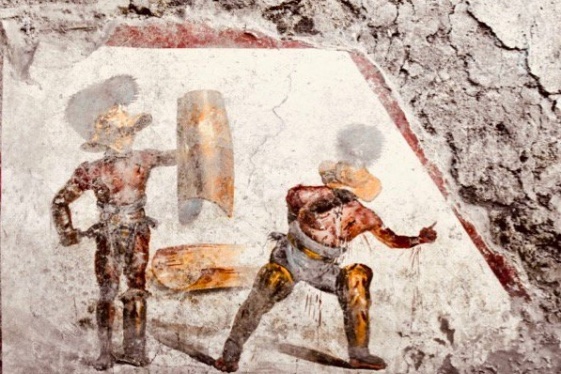 READ MOREA vivid fresco depicting an armour-clad gladiator standing victorious as his wounded opponent stumbles gushing blood has been discovered in the ancient Roman city of Pompeii, Italy’s culture ministry said Friday. The striking scene in gold, blue and red was uncovered in what experts think was a tavern frequented by gladiators, who fought each other...