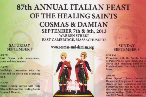 READ MORE2013 Feast Schedule: Saturday, September 7th: 2:00 PM: Feast opens with amusements, games, food vendors, etc. 6:30 PM: Procession with the Saints and the "North End Marching Band" 6:45 PM: Healing Service with Holy Oils and Relics of Saints Cosmas and Damian 7:00 PM - 11:00 PM: Free music performances by "The Reminisants"Em...