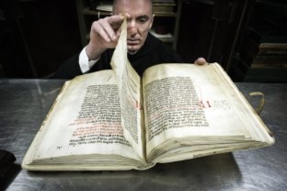 READ MOREScattered around the steel table of a monastery in the Veneto region of Northern Italy are manuscripts, one with green, red and intensely blue medieval miniatures of dragons, another adorned with ornate leaves culminating in golden flowers. A monk gently lays an off-white leather book on the table, and opens it at a long letter A drawn in...