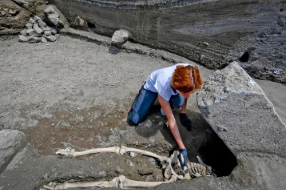 Officials at the Pompeii archeological site have announced a dramatic new discovery, the skeleton of a man crushed by an enormous stone while trying to flee the explosion of Mt. Vesuvius in 79 A.D. Pompeii officials on Tuesday released a photograph showing the skeleton protruding from beneath a large block of stone that may have been a door jamb th...