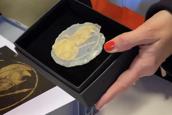 A rare representation of the goddess Roma on ancient gold glass has emerged during construction works for Rome's third subway line, the city has announced. Originally the base of a drinking glass, the discovery features an image of the female deity - the personification of the city of Rome - wearing a helmet and carrying a spear. It is the first ti...