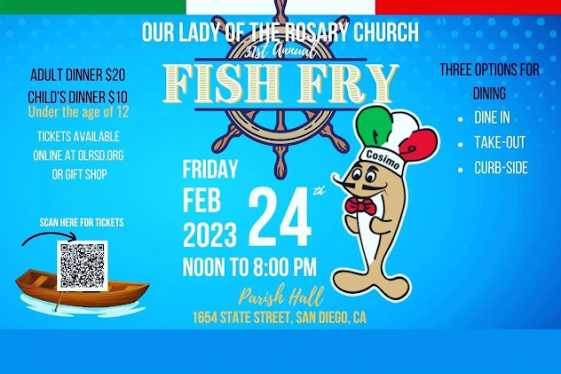Our Lady of the Rosary Catholic Church, a designated Italian National Parish in San Diego's Little Italy neighborhood, is holding its 31st Annual Lenten Fish Fry Dinner fundraiser on Friday, February 24th, 2023. There will be a delicious Fish & Chips lunch/dinner, a Heritage section where you can view through pictures the history of the neighborhoo...