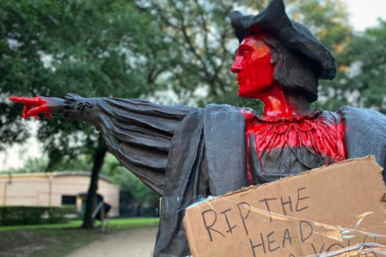 READ MOREThe Christopher Columbus statue at a park near the Museum District has been vandalized again. As in previous incidents, vandals tossed what appears to be red paint on the 7-foot-tall statue, which is located at Houston's Bell Park at 4900 Montrose. The statue also bears a cardboard sign with the message, "Rip the head from your oppressor." It's not...