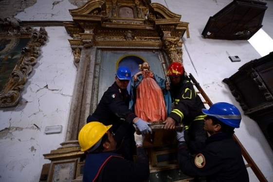 Inside the crumbling medieval church of San Francesco di Visso, the "blue helmets" of the art world are racing to save a masterpiece damaged in Italy's devastating earthquake last year. The crucifixion scene attributed to 15th-century master Paolo da Visso was found in the rubble-strewn church behind a huge wooden wardrobe which miraculously stayed...