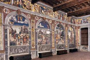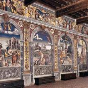 The second, much more interesting mystery, is that a room in the Palazzo Della Rovere in Rome, named "of Penitentiaries", painted by Pinturicchio and now very pale, is pretty much the source of inspiration for the whole cycle, but no one has yet discovered what kind of relationship there was between the two buildings, and especially between the two clients of the works. For sure it is not a simple copycat by Falconetto to the work of Pinturicchio, because at those time the client, not the artist, was the one to decide the theme of the artistic work. So it's unlikely that such a refined and particular iconological choice had been entirely taken and copied without a real relationship between the two places, or between the two client families.