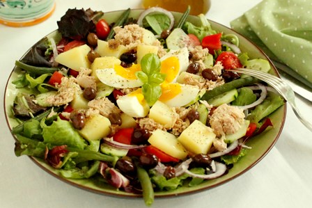 5. You can prepare four individual plates or one large salad to serve at the table. Arrange the lettuce on the plate, then add the green beans, the cherry tomatoes (cut in half), onions, cucumbers, potatoes, eggs, tuna, anchovies and olives. Season with olive oil, a pinch of salt (optional) and pepper. Serve immediately.