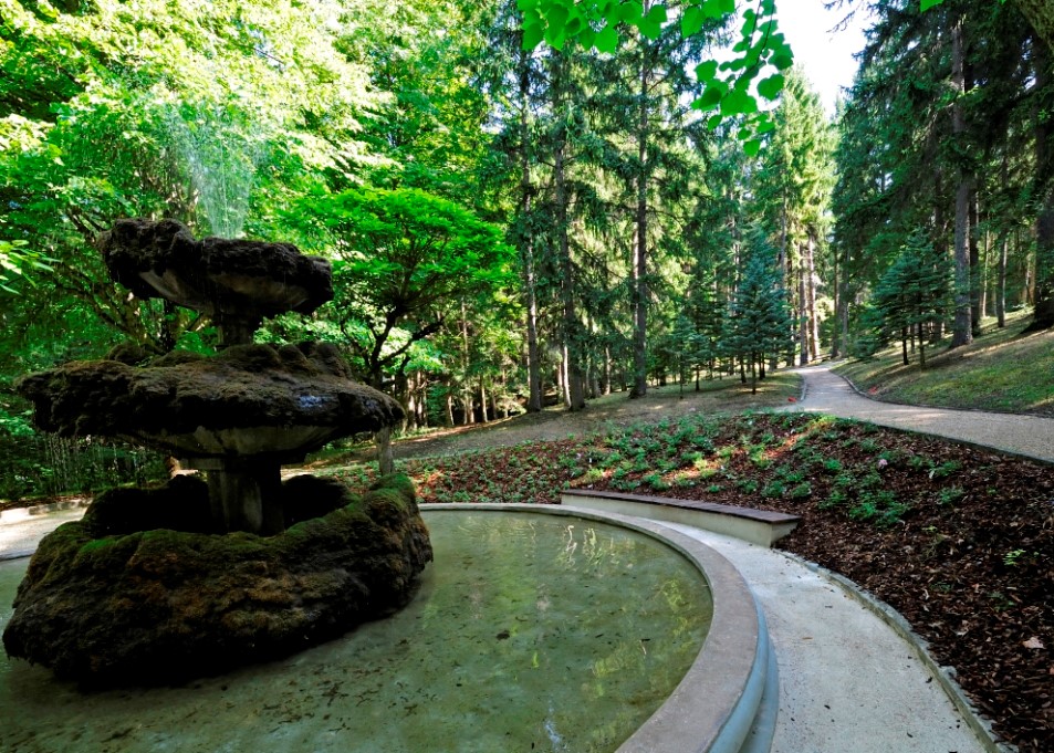 In its moment of greatest splendor, the park extended itself for tens of hectares around the palace. In the back, towards the mountain, Huller created a landscape garden, with groves, spots of conifers, clearings, rocks and streams. At the front, twelve hectares of meadows and fields, where grazed little Dalmatian horses. In the vicinities of the palace, lastly, he realized some neoclassical flowerbeds and at the front an ornamental garden with flowerbeds of annual and bulbous plants and an arboreal gallery to make carriages enter.