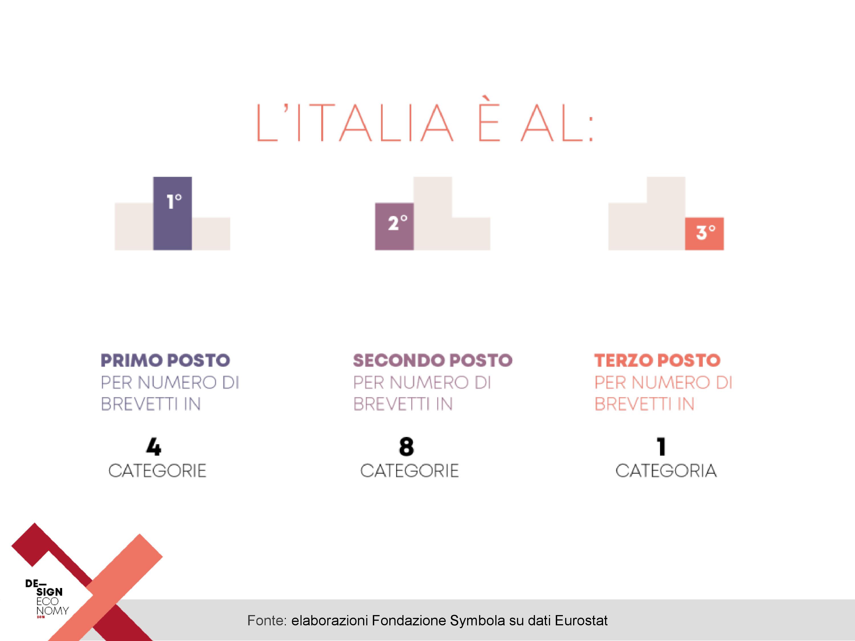 Italy is among the top three countries in terms of number of design patents in 22 of the 32 aggregate categories provided for in the official Locarno classification. In fact, our country is first and second in terms of number of patents in 12 categories including food; musical instruments, textiles; travel goods, furniture; household goods and lighting equipment. As is evident, the numbers do not reflect the complexity of the design system, which is also made up of numerous uncoded innovations and numerous professionals who, working within companies operating in other sectors, spread their skills and permeate the economic fabric of the country in other areas.