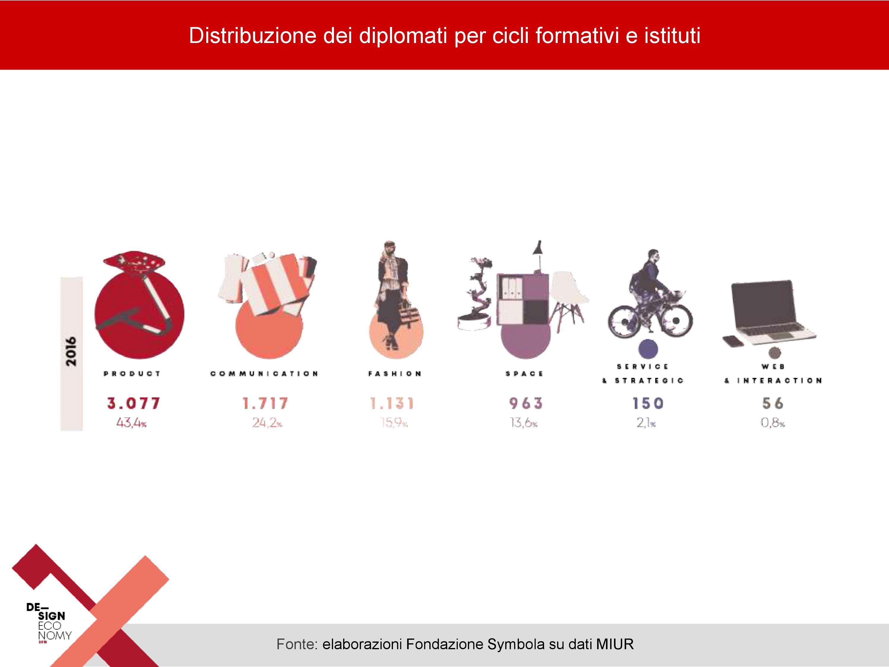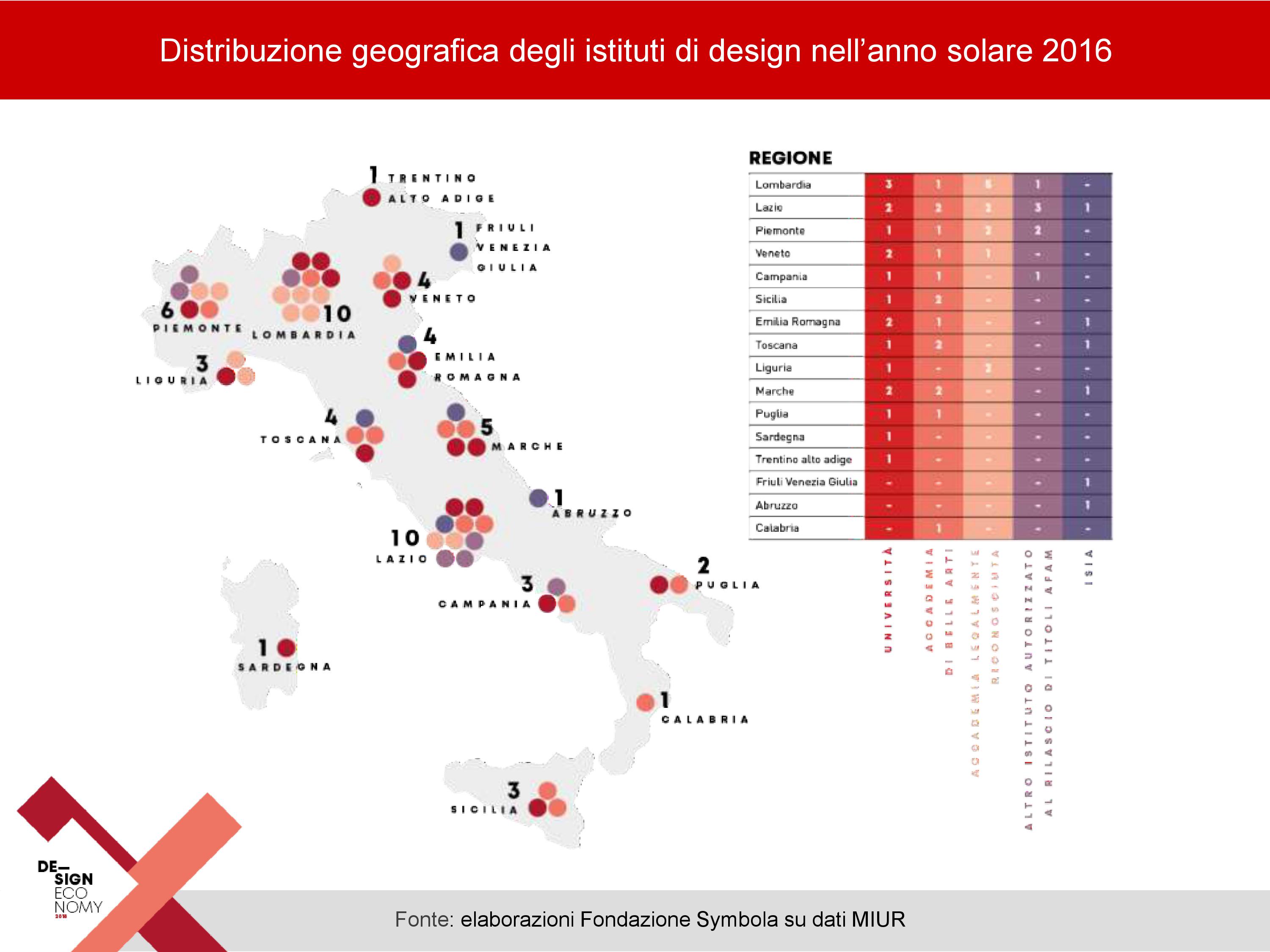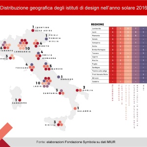 The information framework of the document is completed by an analysis of schools and training institutes, dedicated to those who are entering the world of design. The first figure that emerges is the growth in the number of design students: in the calendar year 2016, there are 7094 design professionals graduating from the training institutes recognized by the Italian Ministry for Education, University and Research. This figure is up by 9% compared to 2014, especially in Lombardy, Piedmont and Lazio, which together make up more than two thirds of all Italian designers.