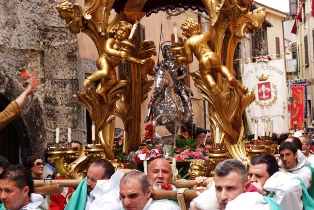 Ferentino, in the province of Frosinone in the southern part of Lazio, celebrates the Feast of St. Ambrose, its patron saint, on April 30. The route of the procession of St. Ambrose, lit by torches, lanterns and lamps, is daunting: between narrow and ancient streets, in a succession of ascents and descents, with people gathered on the edges, the 600 kg statue of the saint is transported by 11 teams of 16 young "incollatori" (literally: those who put the glue), which shift along a three-hour hike through all the districts of the town.