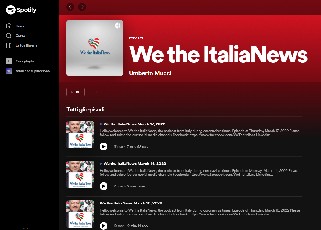 Dear friends, I would like to inform you that the audio version of We the ItaliaNews, the podcast born two years ago and which is now a real news broadcast followed on various platforms and social media by more than 1000 followers for each episode, is also on Spotify. Every Monday and Thursday there is a new episode, which tells you what happens in Italy. You can find it here.