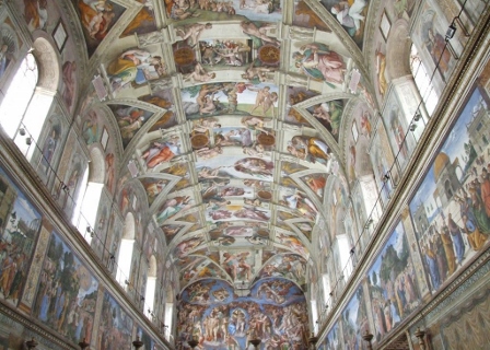 The ceiling illustrates more than 70 picture units: nine scenes from Genesis, four Old Testament histories in the corners, seven prophets and five sibyls, forty ancestors of Christ, ten medallions depicting Old Testament events, and a large multitude of nude figures (yes, nudes, in one of the most sacred places in the world).